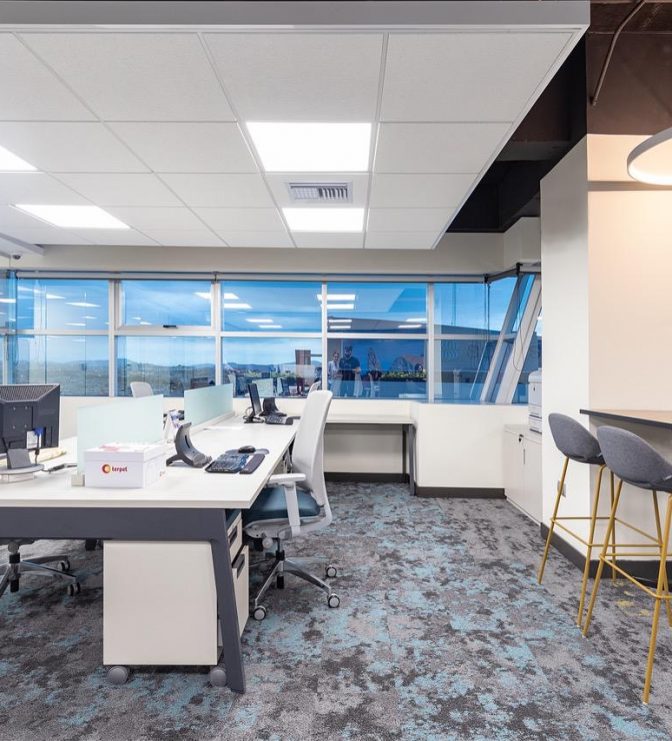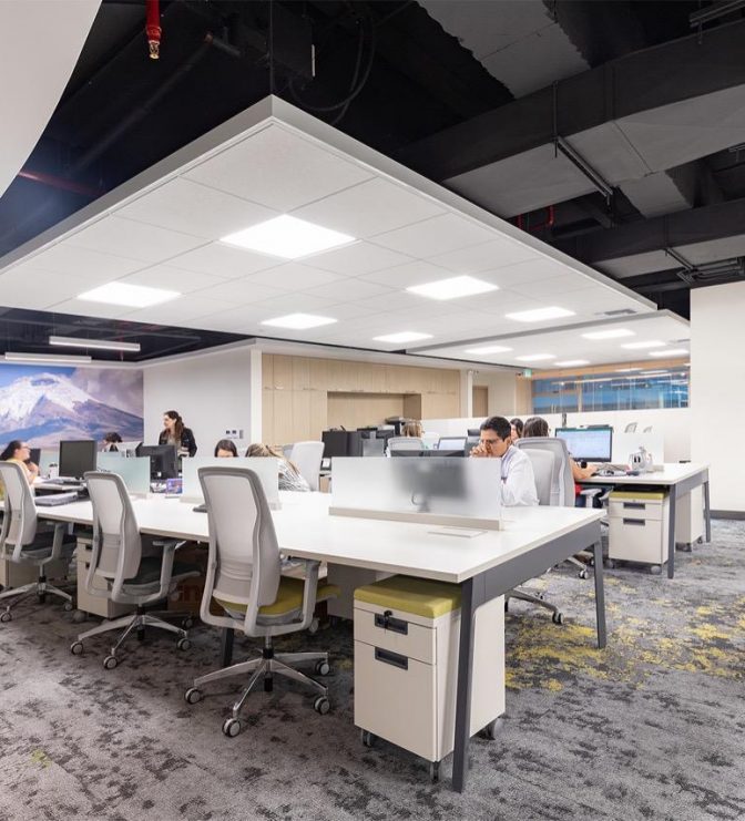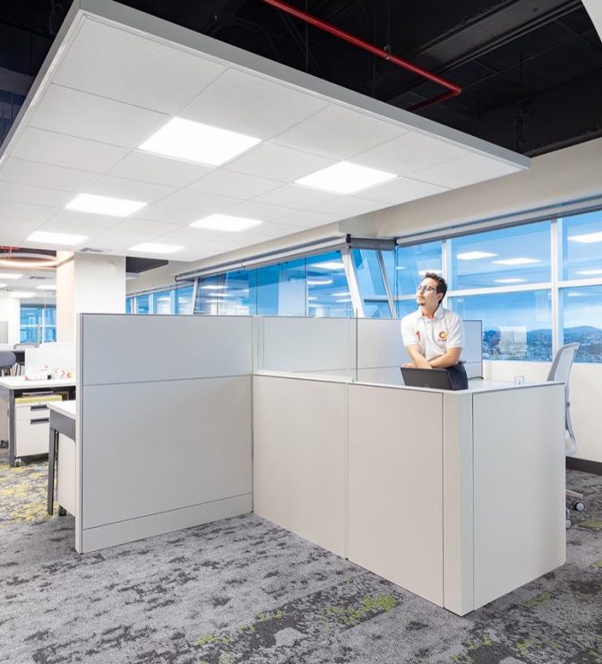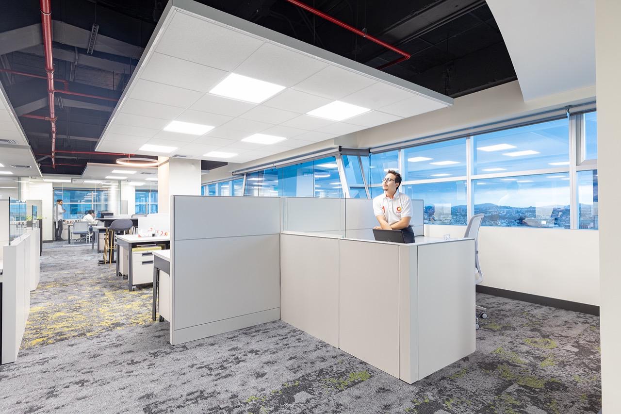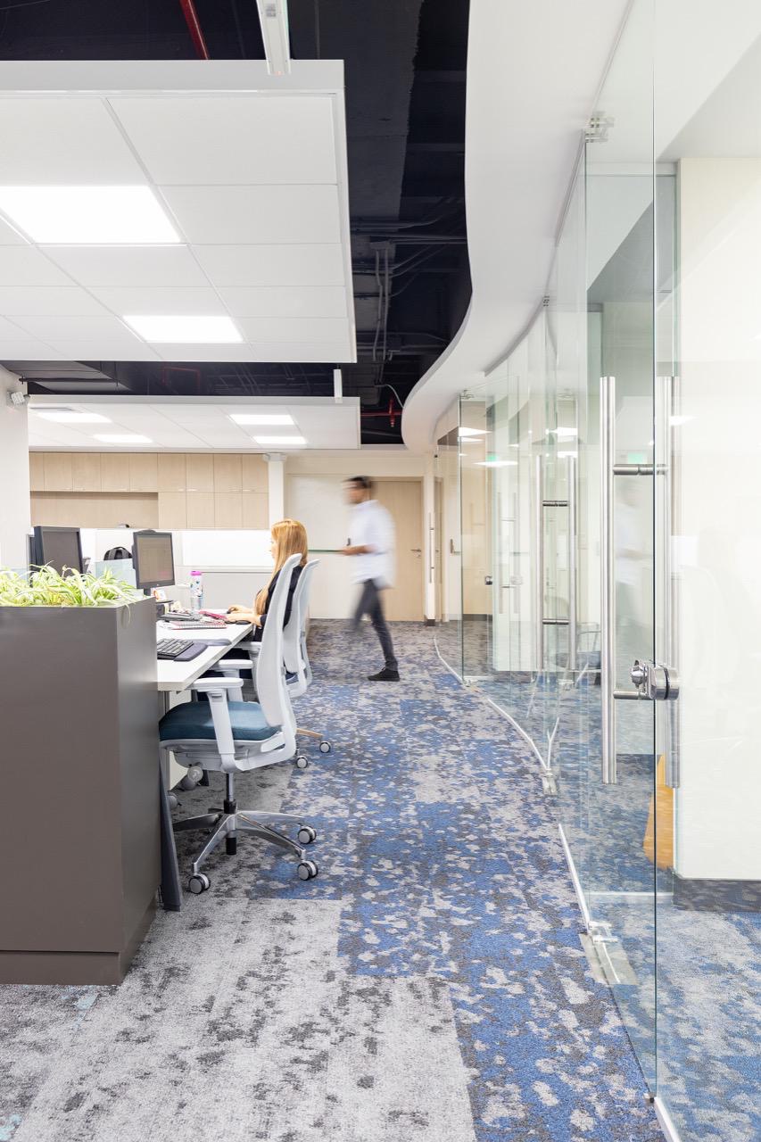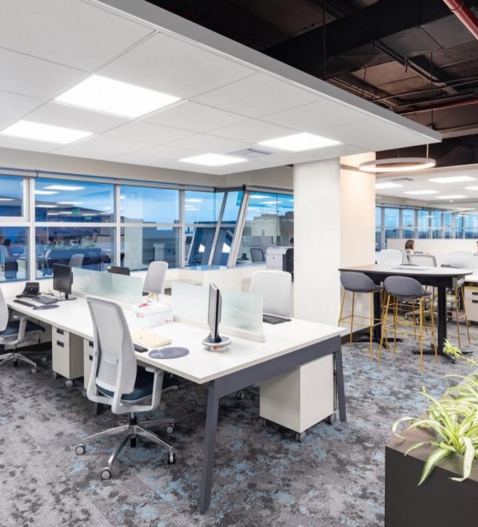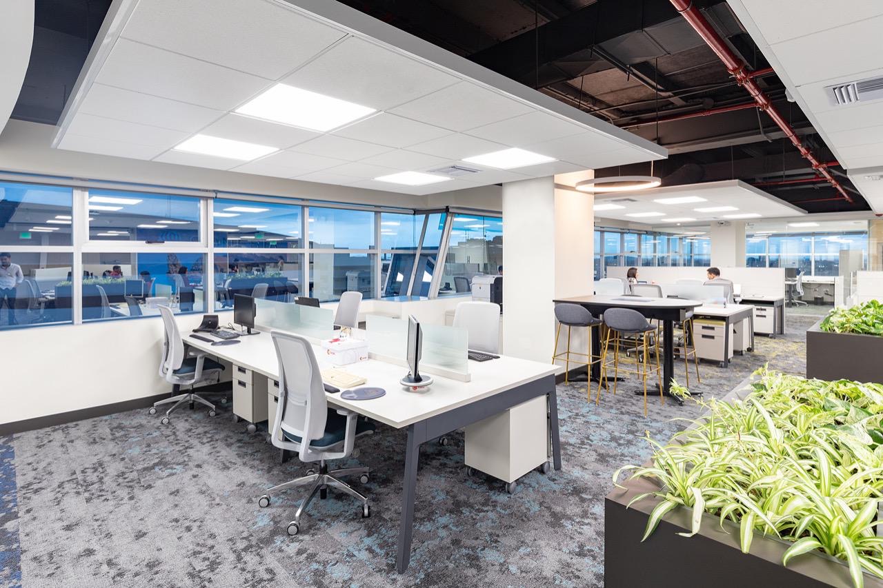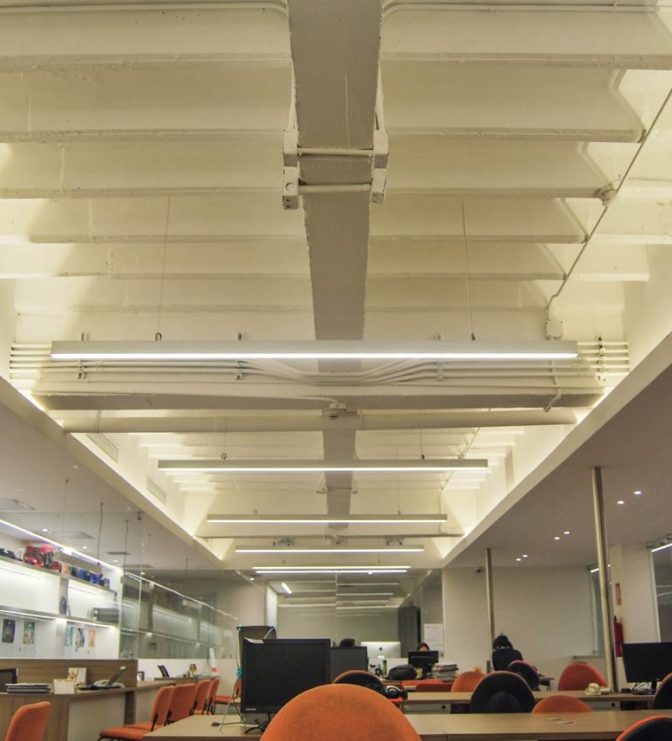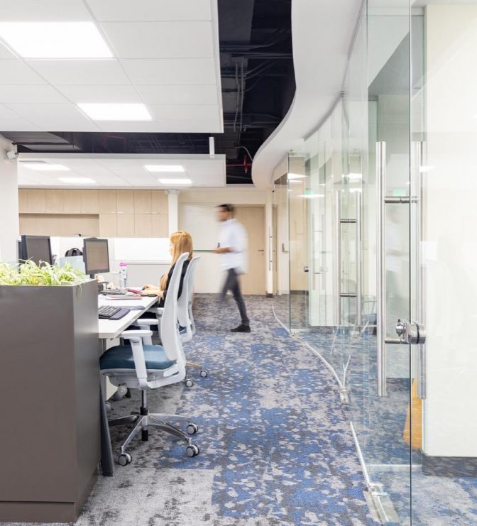 Office spaces conditioned with high-efficiency fan coil units, internally insulated ducts with external black finish, and linear supply and return diffusers.