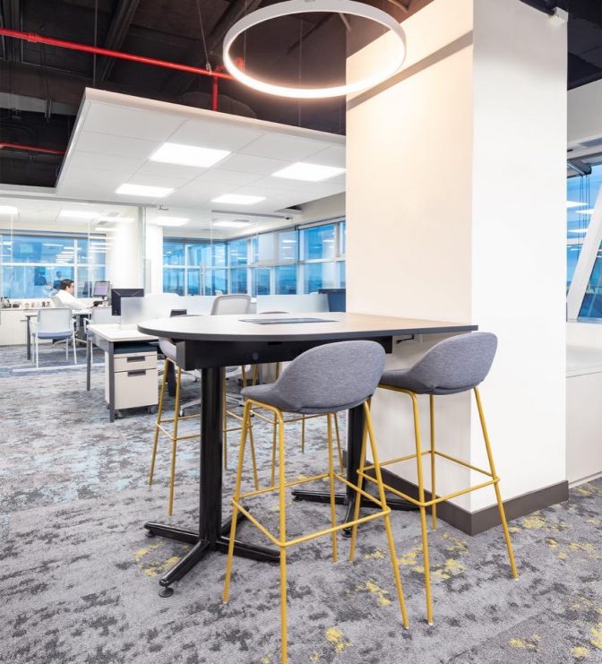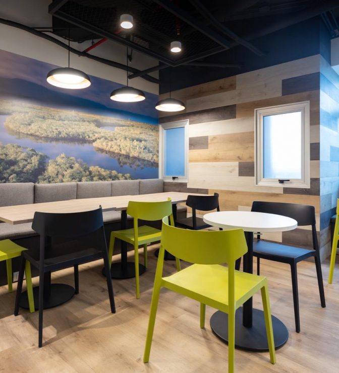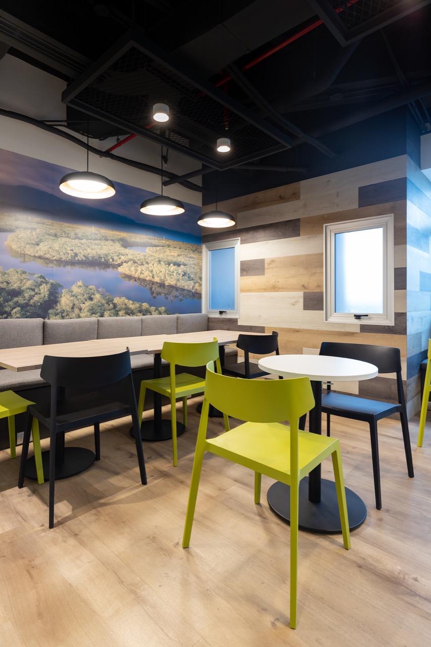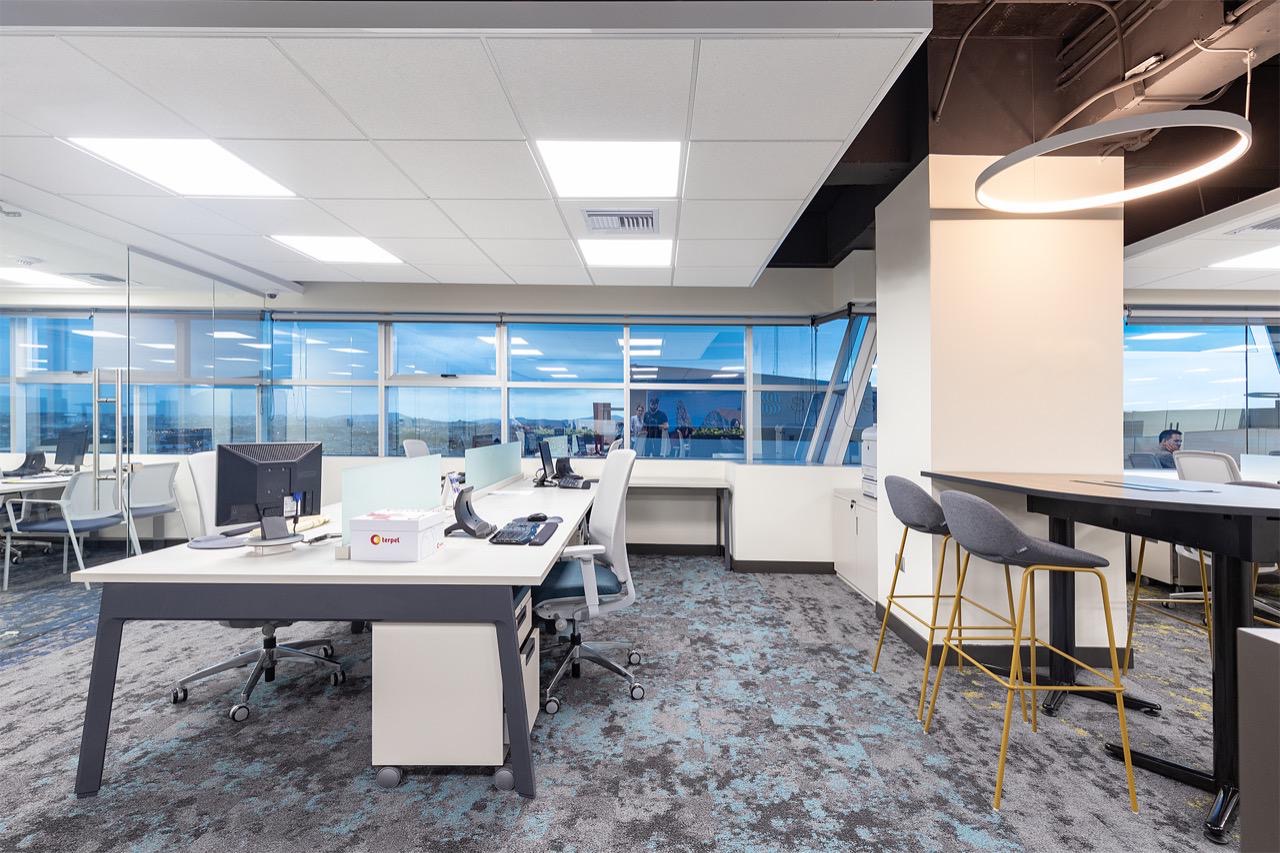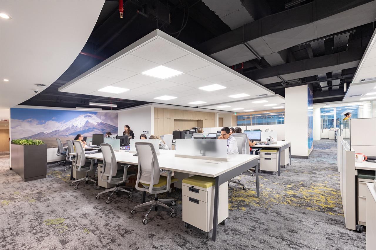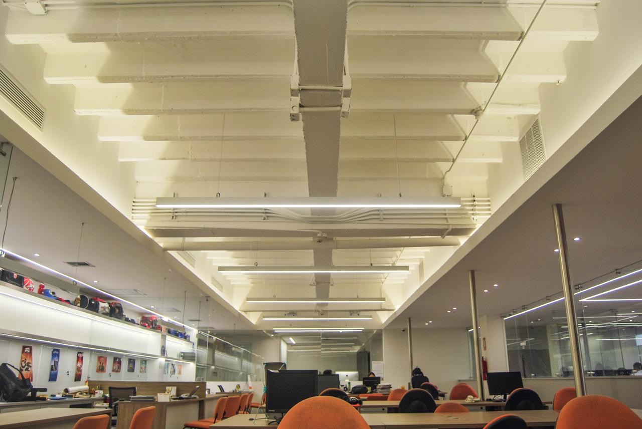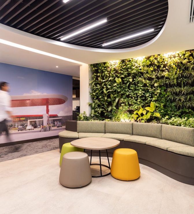Office spaces conditioned with high-efficiency fan coil units, internally insulated ducts with external black finish, and linear supply and return diffusers.